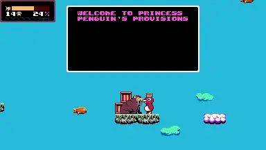 “海鸟皇室”不算太清晰的线索,但我们能够在 #21《Waldorf's Journey》(海象沃德福大冒险)中找到这位角色。这款平台游戏以蓄力跳跃和滑翔降落为基础,拥有悠闲的海边风景与诙谐的动物角色,我们从起始点向右出发,不久就会看见一只戴着皇冠的海鸟,正经营着商店。对话,然后暂停并打开终端: