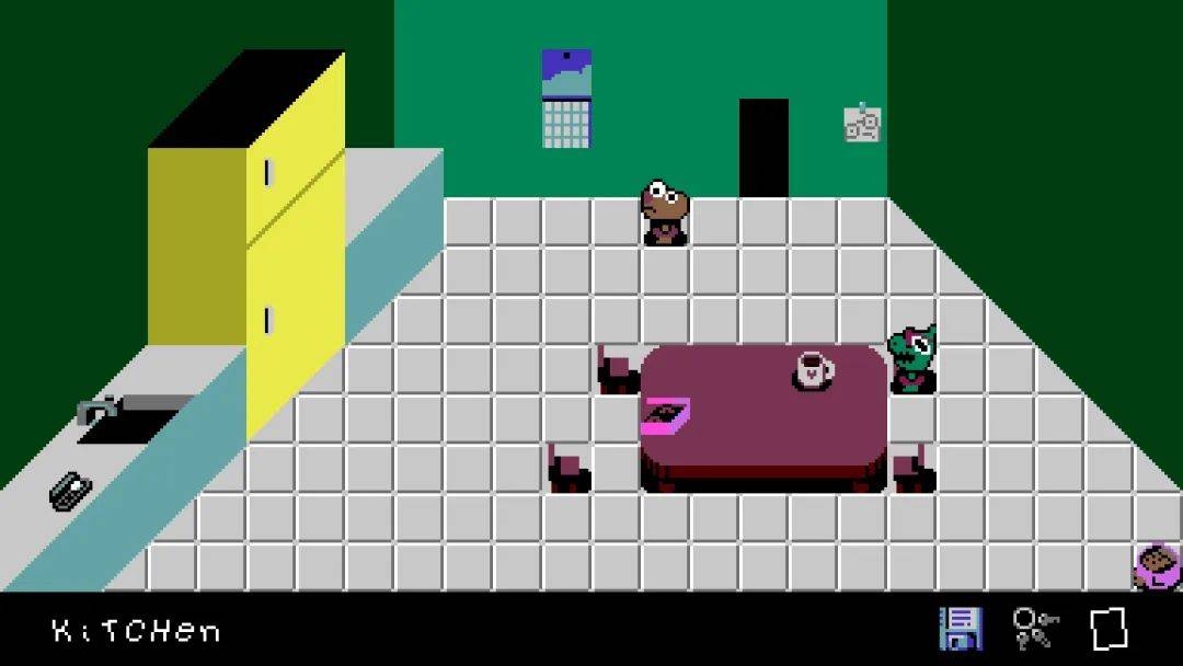 进入厨房,我们决定不去打扰刚睡醒的疲惫员工,因为有更重要的事情要做。在这里,我们将获得一条极为重要的线索,墙上的日历指明了当前时间:1989 年 7 月 24 日,星期一。让我们回顾一下,《UFO 50》中每一款游戏的简介最后都有一段历史介绍,根据上面的描述,50 款游戏的发售时间都在 1982 年至 1989 年之间——这意味着,青蛙主角目前身处的《瘴气塔》的时空,正是刚完成并推出《UFO 50》合集中所有游戏的 UFO Soft 公司内部。更进一步的,我们将探索的秘密,直接与这 50 款游戏的幕后开发历程相关!