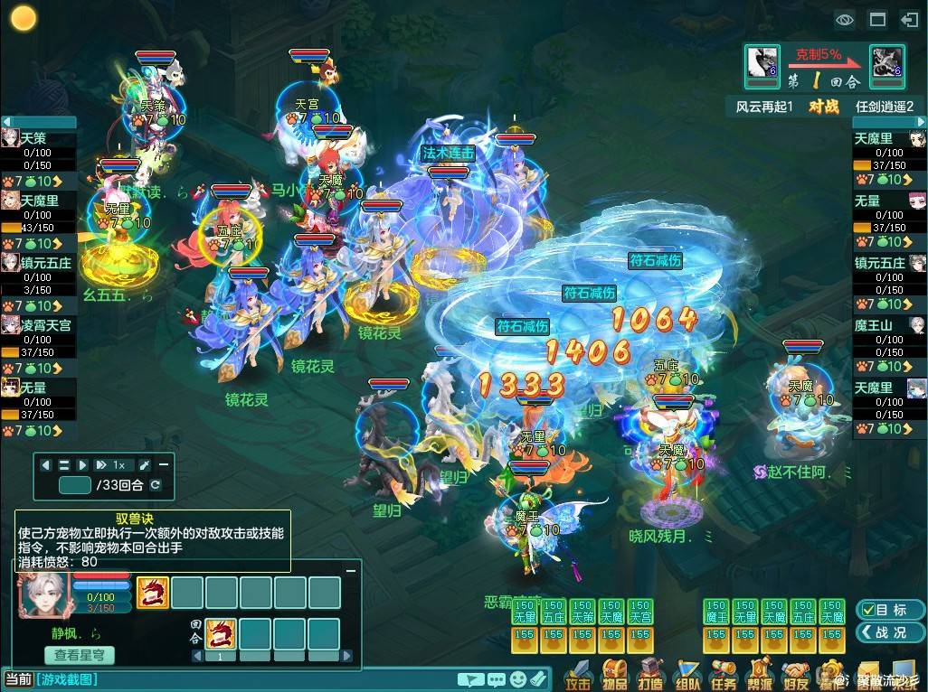 风云再起1队首发5只微抢速的暴力镜花灵,镜花灵必秒绝对血量较低单位的特点使其弹道向宠物单位倾斜,用于首发可实现高效清宠,配合御兽决在比赛前期取得巨大优势。任剑逍遥2队则是选择了常规的5望归开局,虽然运气很好开局5隐身,但镜花灵的爆炸伤害却在首回合误将力五庄击杀,局面一度陷入大劣势。