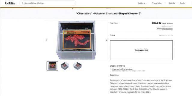 近日,一个形似喷火龙的3英寸薯片以87,840美元的价格在拍卖中成功售出。总共有60次出价——最终出价为72,000美元,加上拍卖行的买家溢价后达到87,840美元。