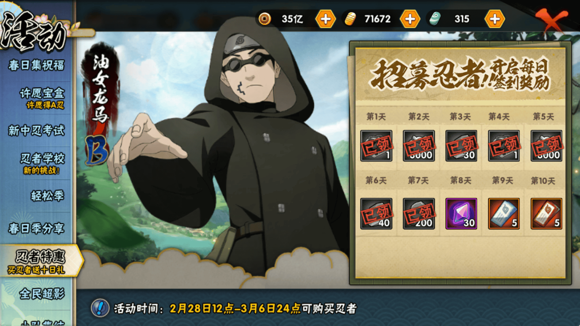 顺便再说几个容易被玩家遗忘的地方,免费的超影和半价购买超影结束时间是7号5点,不要错过领取和半价购买的机会。油女龙马最后购买的时间是3月6日的24点,只要你是在这个时间点之前购买,不用担心后面的签到奖励领不完,这个活动的规则是在你购买了忍者之后开启21天的签到时间,你只需要在这21天内完成签到10天就能拿满奖励了。