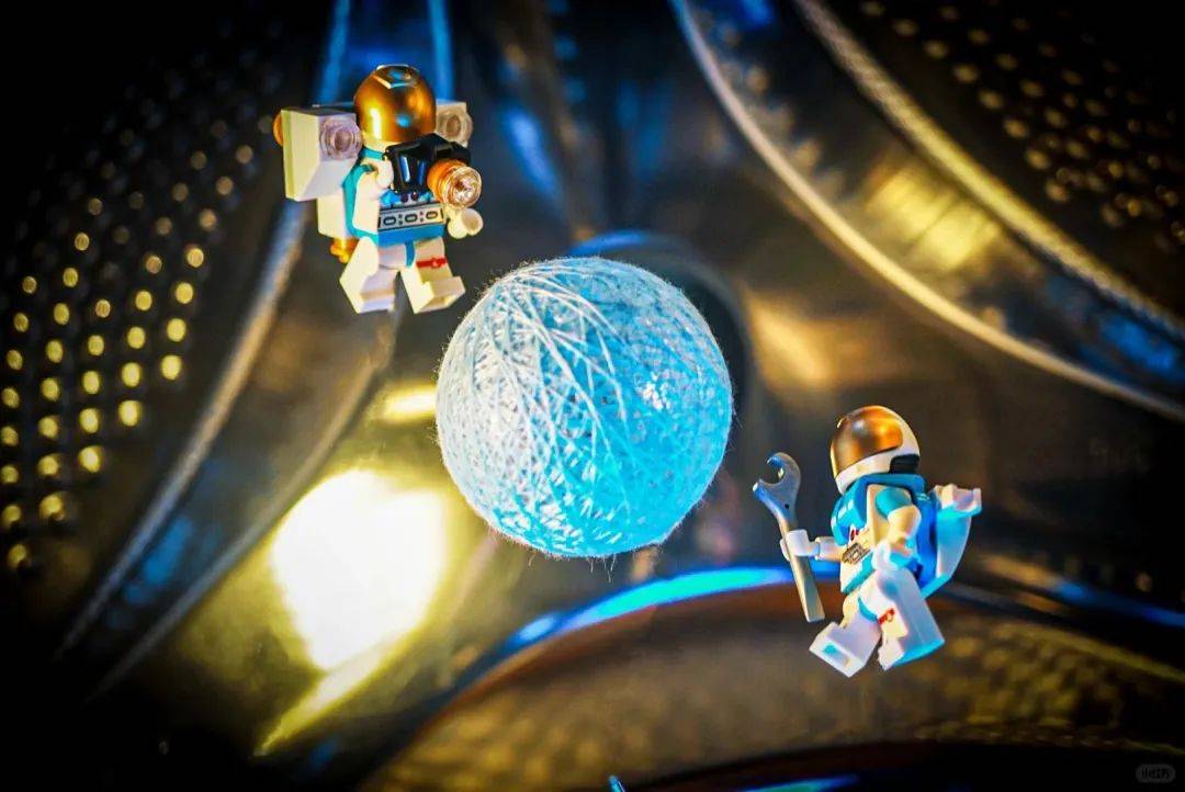 在家中的洗衣机完成拍摄的照片,借助铁丝和鱼线打造太空悬浮感。