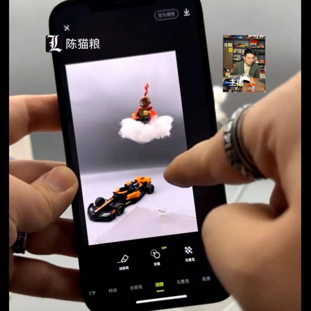 他以乐高赛车照片为例图,分别在手机和电脑上为我们演示了两个简单的修图过程。