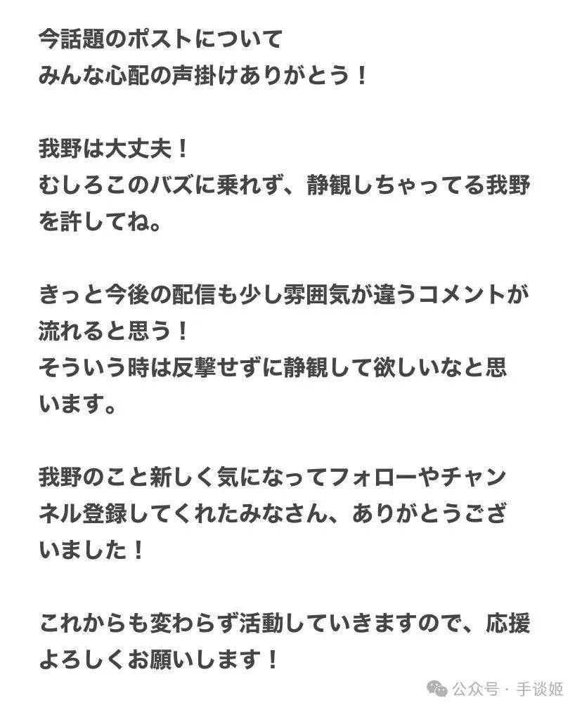 大量的人关注了我野,我野的X粉丝很快就突破了一万,这让我野有些不知所措,她表示这段时间需要先平复一下自己的心态。