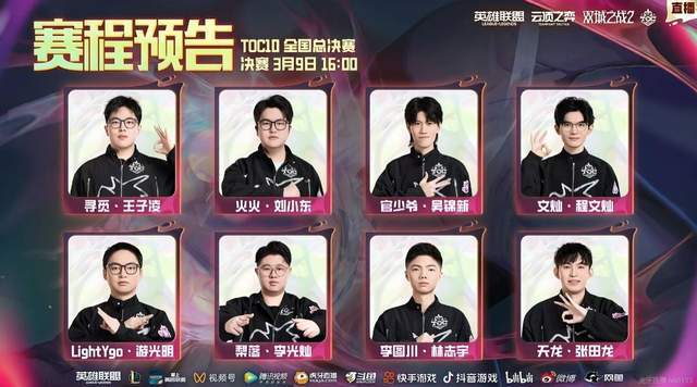 伴随着半决赛突围赛的结束,北京时间3月9日16:00,TOC10全国总决赛将迎来最终的对决。寻觅、火火、官少爷、文灿、LightYgo、梨落、李图川以及天龙这8名选手将在总决赛中去争夺冠军。