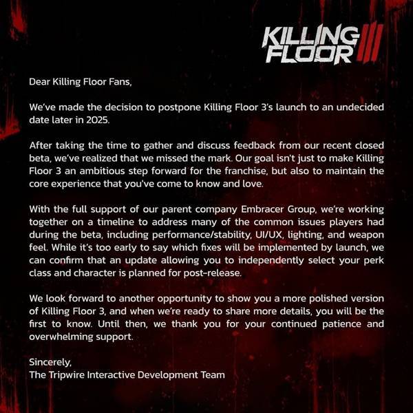 在一份官方声明中,Tripwire详细阐述了这一决定背后的原因。他们表示,在广泛收集并深入讨论了封测玩家的反馈意见后,团队意识到游戏尚未达到既定的目标。KF3不仅要成为系列中的突破性作品,更要保留粉丝所熟悉和热爱的核心体验。因此,面对玩家反映的游戏稳定性、帧率、界面设计、光照效果以及枪械手感等问题,开发团队决定进行更为深入的打磨和改进。