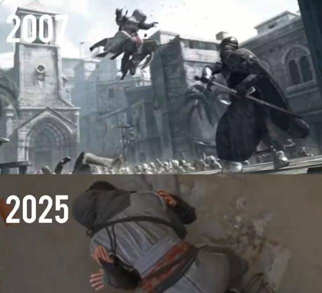 随后有玩家对比了2007年的《刺客信条1》,谁能想到18年后会变成了这样: