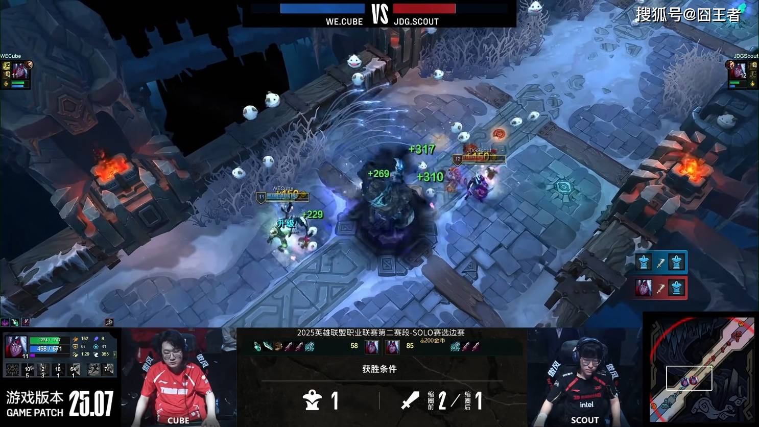 在SOLO选边赛中,Cube韦鲁斯对阵Scout韦鲁斯,前期Scout韦鲁斯抓住机会闪现击败Cube韦鲁斯,拿下一血,缩圈后Scout韦鲁斯推掉对面一塔,拿下胜利。JDG获得本场BO3首场选边权,JDG选择蓝色方