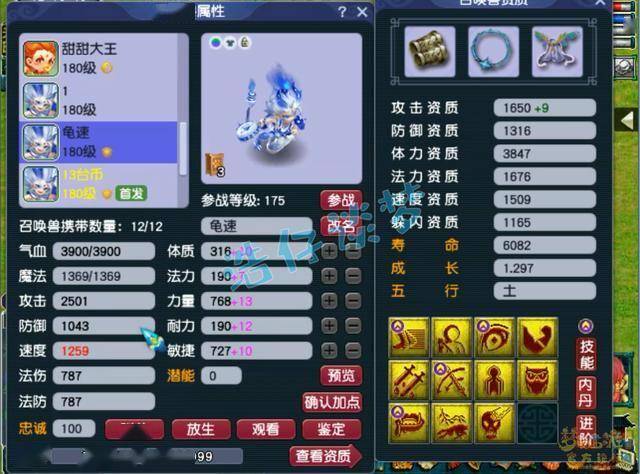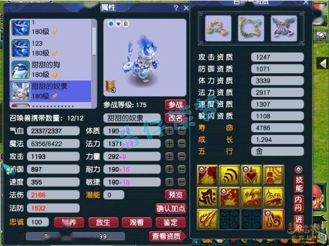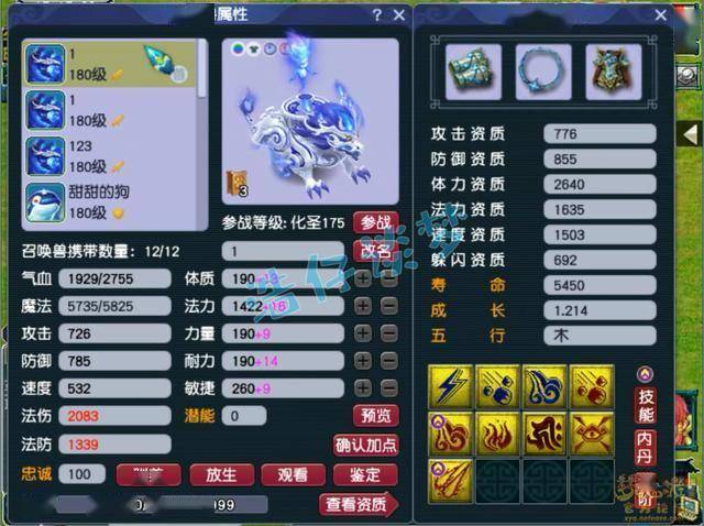 175级方寸山打符之后的面板属性,三维非常不错,有抗性还有速度。