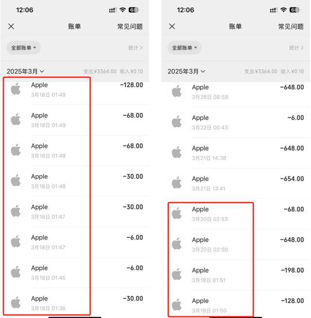 据李女士回忆,今年3月底她意外发现银行卡上的钱对不上之后,查看了苹果手机的微信账单,发现有7天出现了游戏充值,部分时间还在凌晨:3月18日凌晨1点51分充值198元、3月20日凌晨2点50分充值648元……其中3月18日凌晨,充值次数多达11笔、金额近700元。