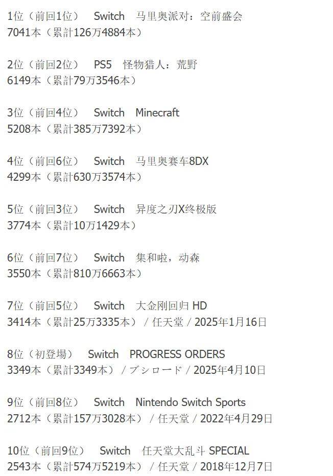 大家好,欢迎来到周末资讯。在4月7日至4月13日的Fami通销量榜上,《马里奥派对:空前盛会》强势登顶,PS5《怪物猎人:荒野》前进一位来到亚军位置,季军则被近期大电影好评而翻红的《我的世界》摘得。