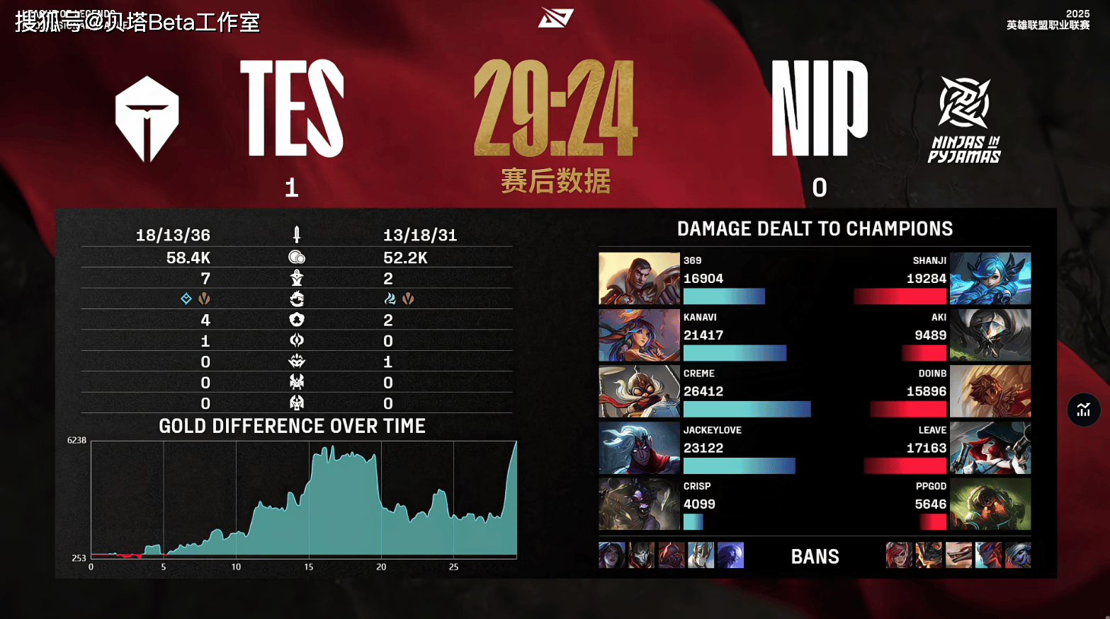 LPL第二赛段登峰组TES和NIP的BO3,双方大战3局之后,TES以2-1的战绩击败NIP,拿下第7胜。NIP则是苦吞4连败。
