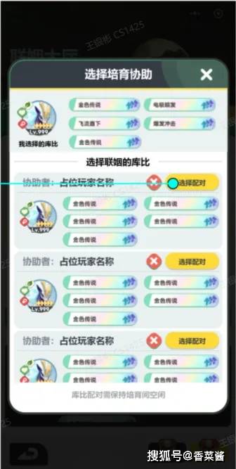当您点击联姻大厅中的某个协助请求时,可查看请求者的库比详情(包括性别、词条属性等信息)。选择符合条件的库比,点击协助培育,即可协助他人、完成联姻。