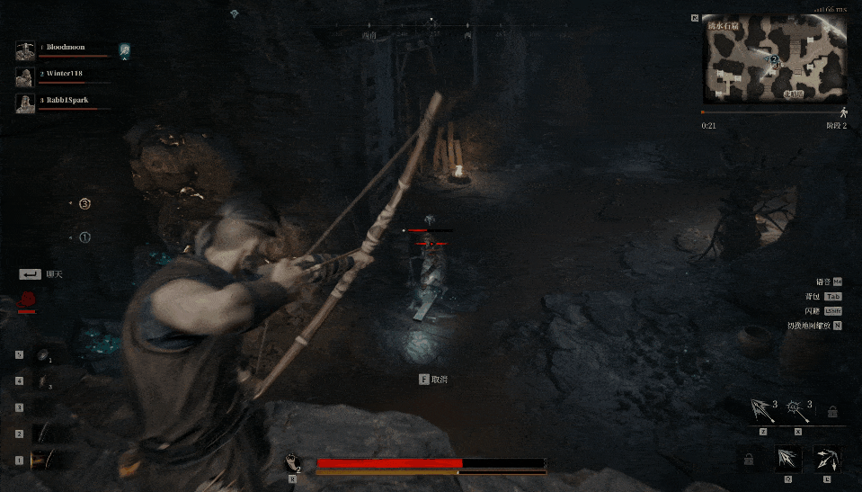 而作为远程武器,弓箭则提供了另一种层面的“爽”。它使用起来灵活轻巧,虽然没有动作取消,但较短的前摇却也保证了动作操作反馈上的快速与及时性,让玩家面对敌人出乎意料的攻击时也能及时闪躲。不过,灵活并不意味着弓箭多么“娇弱”,无论是蓄力拉弓,还是职业自带的蓄力大招,也都在画面与音效表现上拉满了弓箭的力量感表现。而且,弓箭打到敌人的头部也会令其出现明显的硬直表现,精准的受击反馈让攻击变得更具实感。