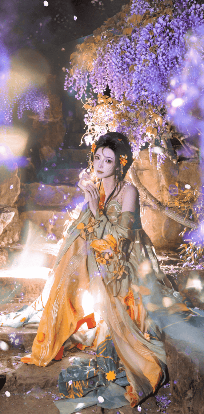 少侠们不仅在游戏内穿,现实世界里更是绝美。穿上后宛若误入仙境的仙子,在紫藤花下演绎诗意江湖。青碧上衣,橙黄裙裾,花朵装饰灵动俏皮,举手投足间尽显婉约优雅,让你成为现实中最靓的仔。