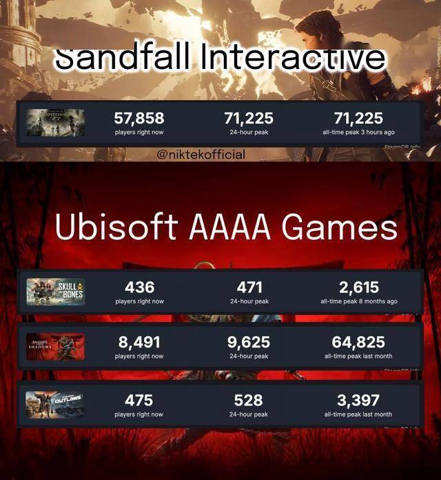《光与影:33号远征队》Steam同时在线峰值超过7万人,网友NikTek发现《光与影:33号远征队》的表现超过了同样是法国游戏公司育碧今年和去年在Steam发售的任何游戏,包括《刺客信条:影》。育碧至今仍然不敢公开《刺客信条:影》的实际销量。