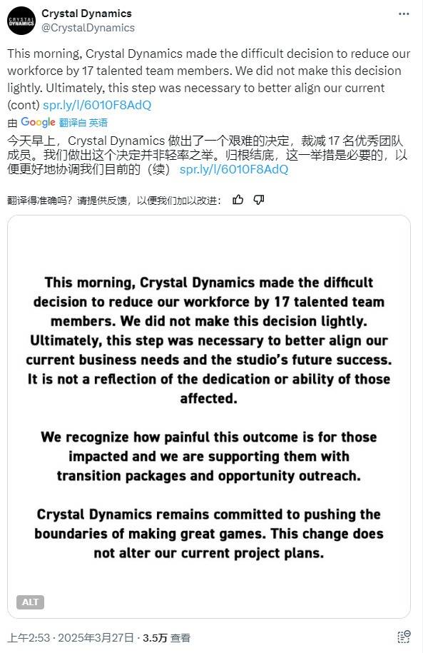 “今天早上,Crystal Dynamics 做出了一个艰难的决定,裁减 17名优秀团队成员。我们做出这个决定并非轻率之举。归根结底,这一举措是必要的,以便更好地协调我们目前的业务需求和未来的工作发展。”