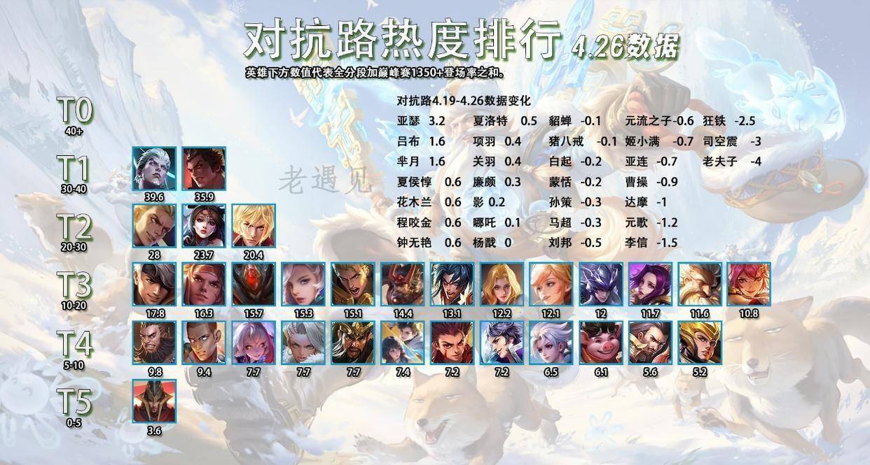 最后再聊一聊两个比较惨的英雄,扁鹊和蒙恬,都是分路垫底的存在,还是分路唯一的T5,连个作伴的人都没有。扁鹊之前发育路火了一阵,吹的那么多,但终究是一阵风,现在已经无人问津,这个英雄的定位跟几个辅助有重叠,蔡文姬,桑启的奶足够用了,中路这个位置来一个以奶为主的英雄实在是没什么竞争力,自身其他方面的素质也不够出色。