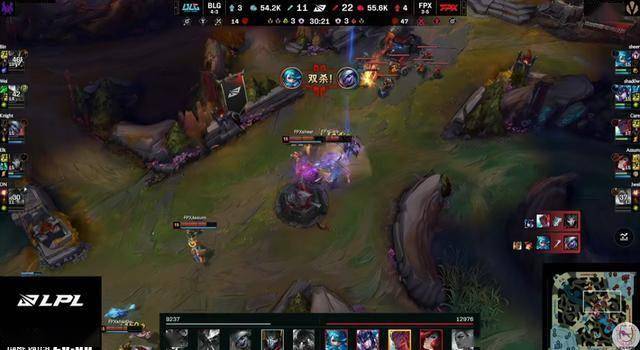 FPX的猪妹前期节奏完美,另外双人组换线之后Bin连续阵亡导致MF的发育无解肥。而BLG最夸张的是打野选手Wei,前15分钟0-0-0,和队友完全是0互动。