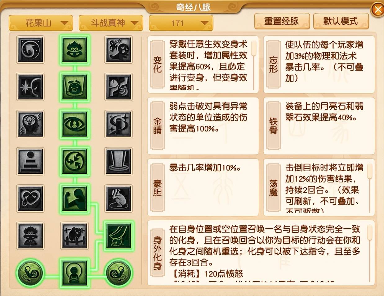 花果山目前有两种玩法。对于以物理输出为主的小伙伴来说,【斗战真神】依然是最佳选择,经脉推荐采用“2222232”的点法。这样点不仅能提升任务输出,还可以稳定获得13%的物理暴击几率,如果击杀怪物的话,还可以获得一个增加12%的伤害结果BUFF,刷任务嘎嘎猛。