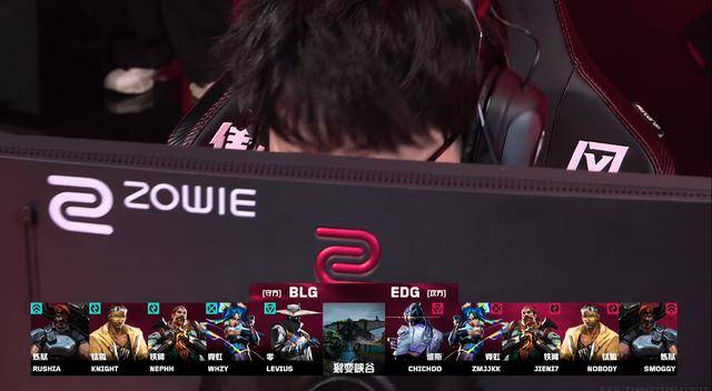 下半场BLG赢下手枪局,EDG从奖励分开始连拿四分,第18回合康康一把莽侠轻松守住B大,奈何BLG枪械太差没能赢下,EDG四连胜拿到11分。第19回合BLG进攻B点,包被打掉,EDG三人直架守包拿到赛点,BLG挽回一分,但在第21回合又被EDG在A点残局二打三赢下,EDG 13-8赢下裂变峡谷。