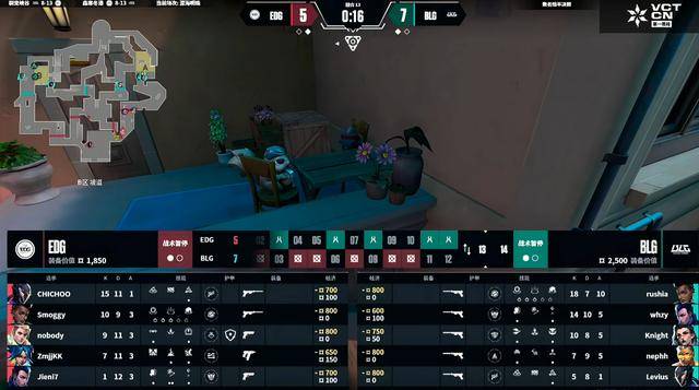 上半场BLG赢下手枪局,EDG从奖励局开始拿分,EDG在拿到信息之后,回去选择转点进攻,开局的慢节奏进攻,让Levius零的拌线毫无效果,EDG对于零的防守拌线预警很强,在拿到信息之后转点安包打BLG的回防,这让EDG连拿五分。第8回合BLG暂停起到效果,BLG在A小直接前压大对枪,通过技能的协同铺盖,BLG成功拿下这分。第9回合EDG打A失败,双方残局就剩下nobody与rushia,nobody极限时间进点转身一枪打掉rushia,EDG连拿两分后,最后一个回合被BLG赢下。上半场EDG 7-5 BLG。