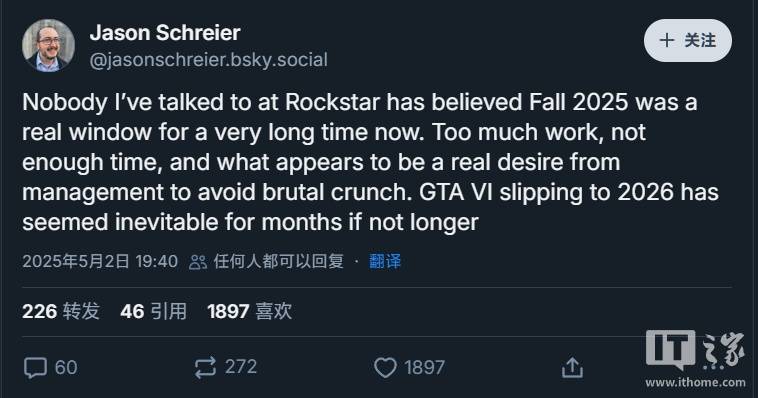 他直言,自己接触到的 R 星员工中,没人真正相信游戏能在原定的 2025 年秋季如期上线。“我问过不少 R 星内部的人,他们几乎早就不把 2025 年秋季当回事了。项目庞大、时间紧张,再加上公司管理层也确实想避免高强度的加班赶工,这个延期其实早就注定了。”