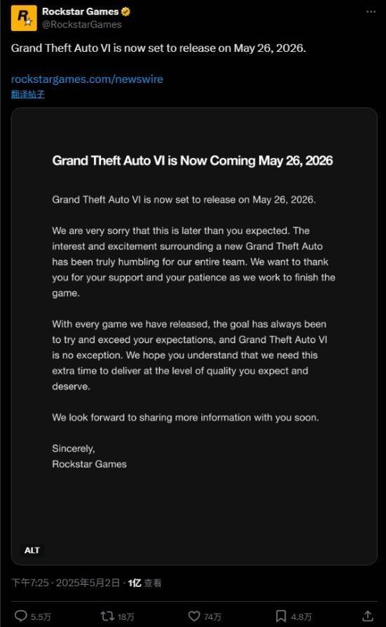 Rockstar Games近日在官方推特上公布了一则令全球玩家惊讶的消息,《GTA6》的发售日期已从原定的2025年秋季推迟到了2026年5月26日。这一变动迅速引起了广泛关注,相关推文的浏览量迅速飙升过亿,评论数也超过了5.5万条。