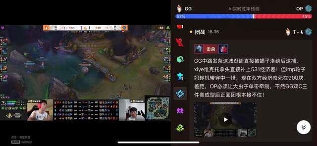 你还别说,这个推荐功能堪比教练,和选手们实际选出的英雄也差池不大,如果Ai拥有足够多的数据,那BP这活说不定还真能做的比人更优秀。结合直播内容一同展示,最直观的感受就是,当教练做出让人出人意料的BP时,从Ai分析就能直接看出这手BP的优劣,究竟是观众们纸上谈兵,还是教练神来一笔,Ai数据分析直接告诉你答案。