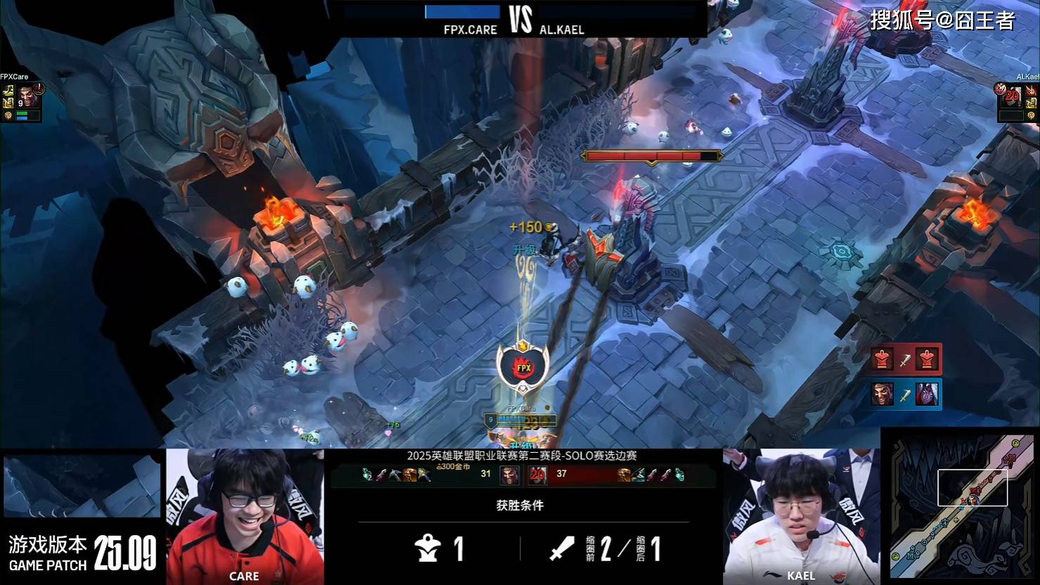 在SOLO选边赛中,Care德莱文对阵Kael韦鲁斯。缩圈前,Care德莱文先手击败韦鲁斯,随后再次击败韦鲁斯,获得胜利。FPX获得本场BO3首场选边权,FPX选择蓝色方。