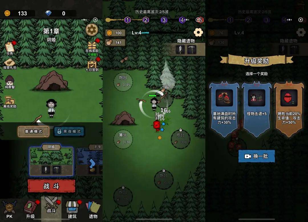 转刀2.0:割草+塔防,玩法在保留割草爽感的基础上(转刀割小怪也割地形如树木、墙等),引入塔防策略与场景互动机制(如破坏地形障碍物),并通过微恐题材增强叙事沉浸感。视听冲击强化情绪共鸣,吸引对传统割草审美疲劳的中重度用户,这一阶段产品更注重长线养成。