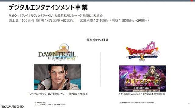 与上一财年相比,由新作发售所带来的销售额下滑,导致整体收入下降。但同时开发成本摊销压力及广告宣传费用也较上一财年有所减少,加上2024年11月发售的《勇者斗恶龙3 HD-2D重制版》的销售表现超出公司预期,以及MMO《最终幻想14》最新大型资料片“7.0金曦之遗辉”的推出,最终使营业利润较上一财年有所增长。该财年游戏软件(实体+下载,包含MMO)总销量为2545万份。