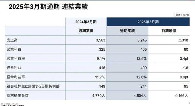 Square Enix今日公开24-25财年年度财报,该财年销售额3245.06亿日元,同比减少8.9%,营业利润405.8亿日元,同比增长24.6%。