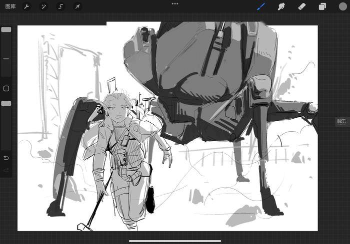 他向我展示了自己的作品库,里面有不少半成品,还有一张未完成的草稿。“那晚实在太想游戏了,拿起笔就开始画,一直画到凌晨,困得实在撑不住就睡着了。第二天起来,完全不记得画到哪里了。”画面中,他笔下的角色正被游戏里的四足机器人“堡垒”穷追不舍——老张每次在游戏中遇到这个敌人,总是凶多吉少,这似乎成了他的“心魔”。
