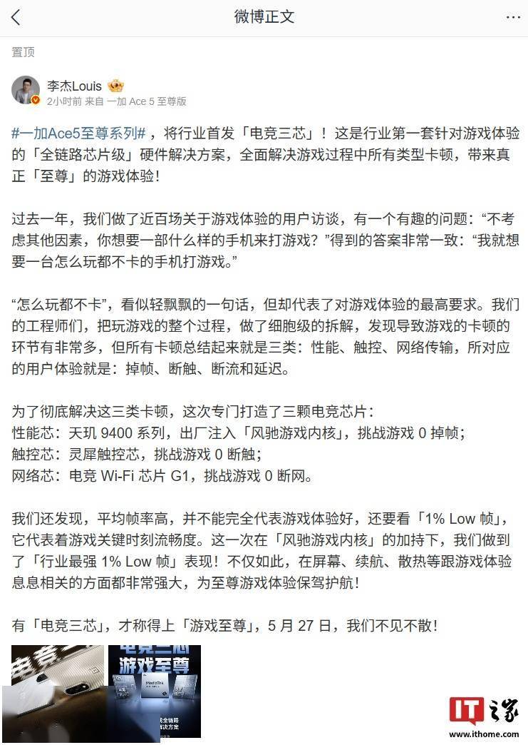 一加中国区总裁 @李杰Louis 今日发文介绍了 Ace5 至尊系列手机相关信息:新机将行业首发「电竞三芯」,同时做到了「行业最强 1% Low 帧」表现。李杰微博原文如下:
