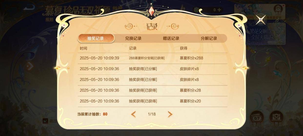 80抽,所有的皮肤道具等全部兑换成积分,有1993,兑换貂蝉新皮肤需要1788,天幕998。