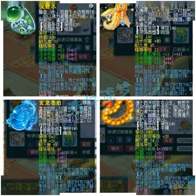 戒指下排三法伤,耳饰下排双法伤一法暴,佩饰下排三防御,手镯下排双防御一气血,特效都是7级163。