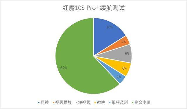 红魔10S Pro+续航方面,实测一小时《原神》游戏耗电16%,一小时1080P视频播放耗电4%,一小时短视频耗电8%,一小时微博浏览耗电6%,一小时视频录制耗电4%。在打开散热风扇增加功耗的情况下测试还有这样的表现,相信日常使用续航会更长。