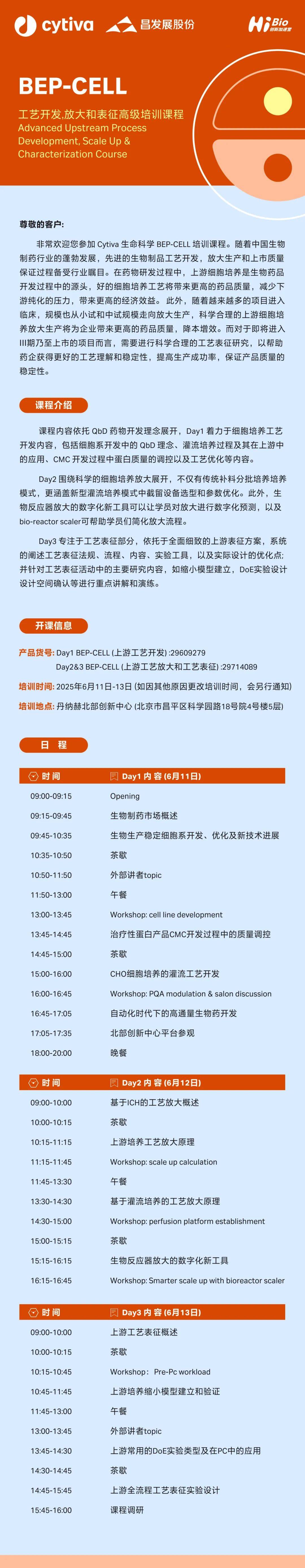 HIBIO.创新加速营|昌发展&思拓凡联合举办《BEP-CELL工艺开发,放大和表征高级培训课程》即将开始!