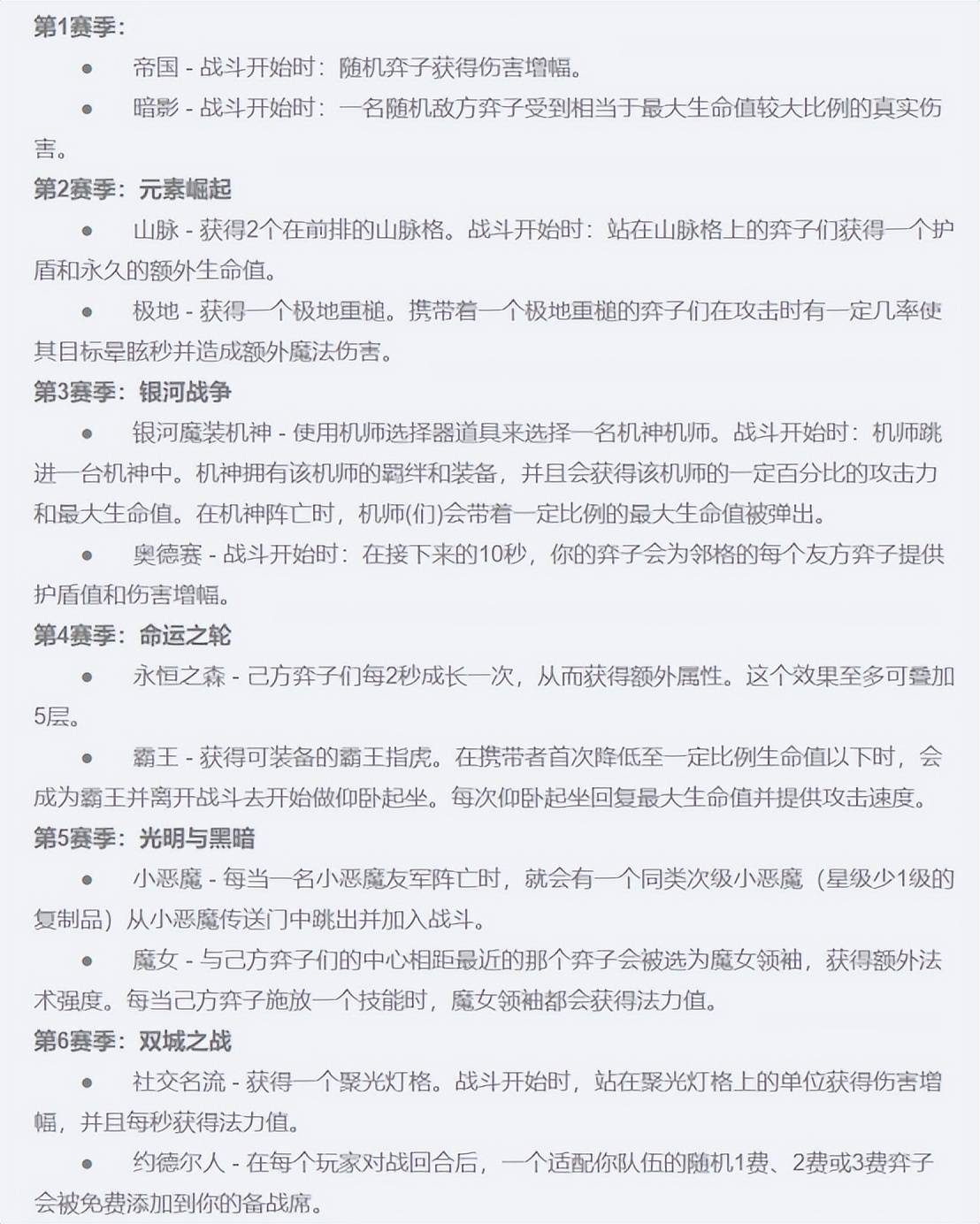 但在回归的26个老羁绊中间,也不乏凑数的羁绊,让人十分怀疑这些羁绊的实际强度。比如说S1的帝国(随机帝国棋子获得伤害加成)、S2的山脉(多两个山脉格子)、S3的奥德赛(开局的伤害加成)、S8的吉祥物(阵亡后,给队伍提升治疗加成)、S10的爵士乐(根据羁绊激活数量给额外的属性)、S11的天龙之子(战斗后8秒召唤天龙击晕对面)。