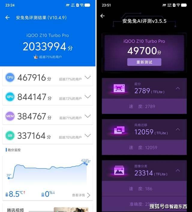 Geekbench 6.4单核心2124分、多核心6710分,单核心性能表现亮眼;Geekbench 5.5.1中单核心1561分、多核心5907分,表现同样优秀。此外GeekBench AI测试也验证了iQOO Z10 Turbo Pro具备一定的AI算力。