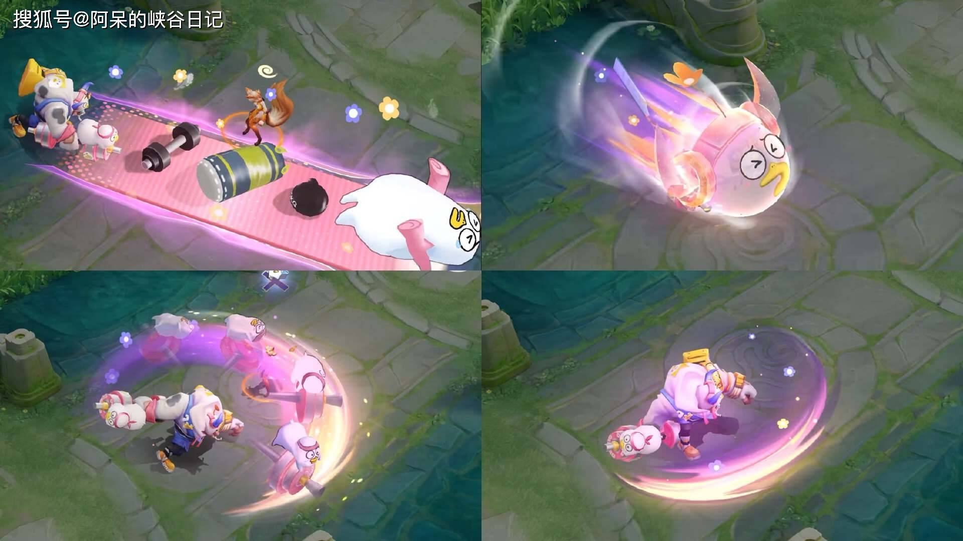 三技能使用后会出现健身小刘鸭,瑜伽垫、哑铃全上场,一个一个的向前铺垫,然后还可以看到一些小花花元素。