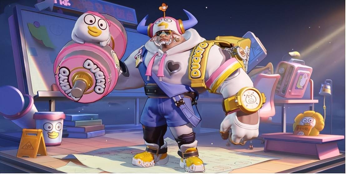 三技能,牛魔会将瑜伽垫、哑铃、沙袋、壶铃、一只正在健身的小刘鸭召唤出来,对前方进行一次劈砍。