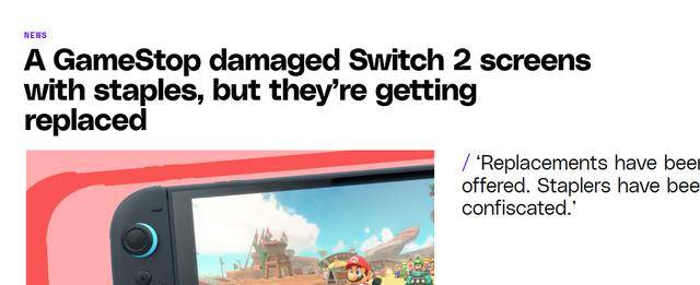 【环球网科技综合报道】近日,一些在GameStop预定NintendoSwitch 2的玩家在取货时遭遇了意想不到的麻烦。6月6日,据IGN报道,部分玩家发现,用于固定收据的订书钉竟然穿透了Switch 2的包装盒,并刺破了游戏机的屏幕。