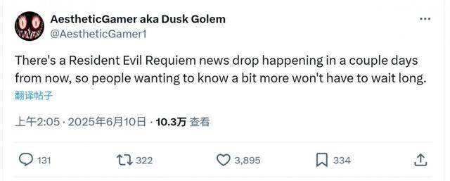 《生化危机》舅舅Dusk Golem发推称,《生化危机9:安魂曲》几天后就有新的消息发布,而且是官方消息。所以希望进一步了解《生化危机9》的玩家也不用等太久了。