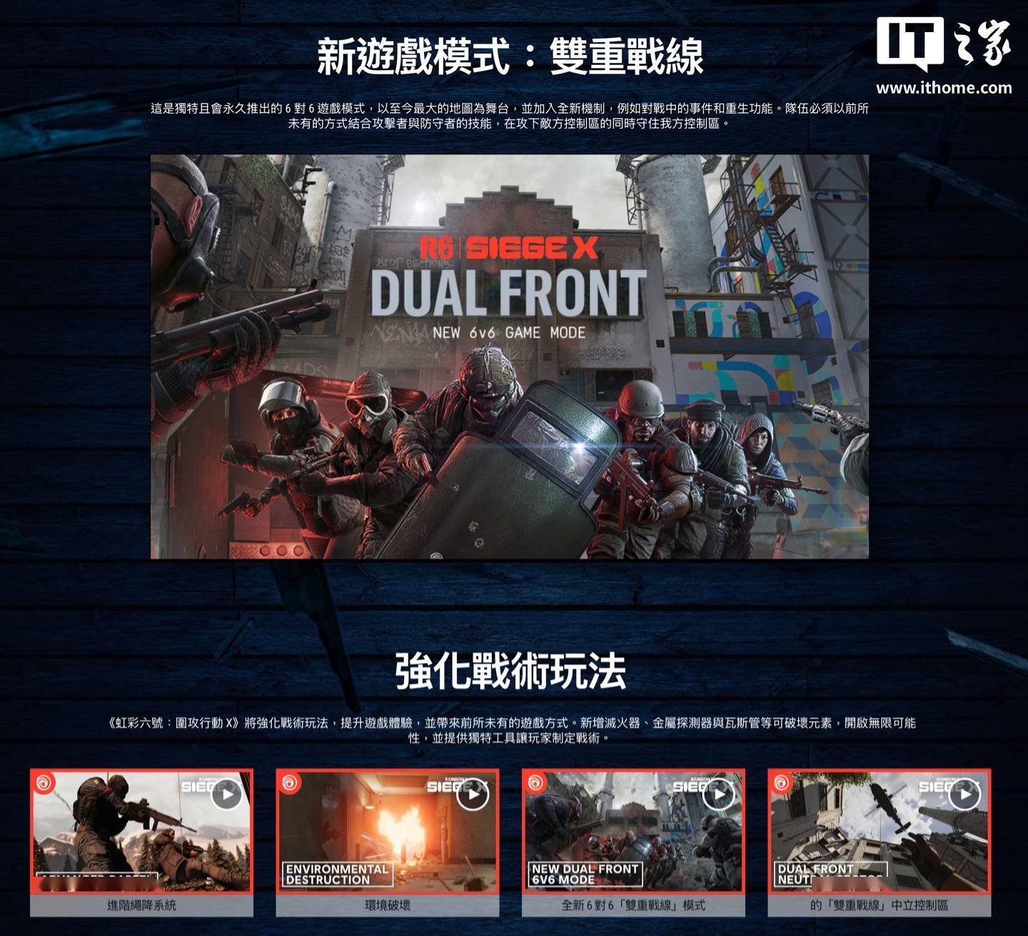IT之家获悉,《彩虹六号:围攻 X》是原版《彩虹六号:围攻》的加强版本,采用了新版引擎,并使用了全新的游戏声响设计,同时增加了 6v6“双重战线”游戏模式。