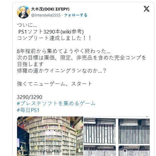 ·大木茂(@InterstellaSSSS)发X称,根据维基百科的资料记载,自己已经集齐了索尼互娱的一代主机PS发行游戏全部3290部,包括廉价版、限定版以及非卖品,一应俱全,堪称始祖级别收藏。
