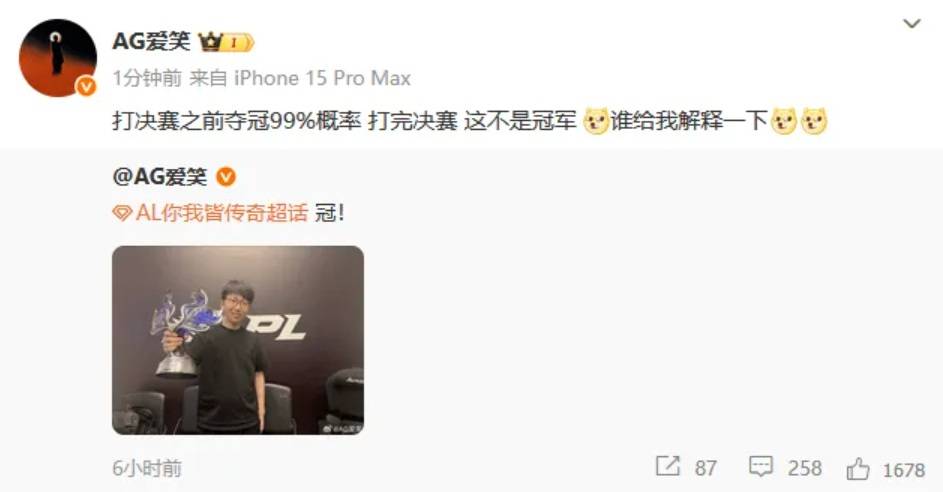 Bin的这个言论在赛后以很快的速度冲上了微博热搜,而AL的经理爱笑也是直接在微博上面炮轰Bin,晒出了自己拿着奖杯的照片并且给出了评论:打决赛之前夺冠99%概率,打完决赛说这不是冠军,谁能给我解释一下。
