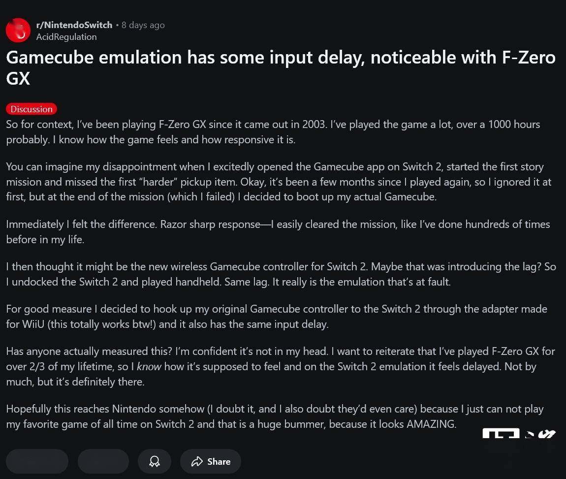 一位在《F-Zero GX》(GameCube 经典竞速游戏)2003 年刚发布时就开始游玩,且累计游戏时间超过 1000 小时的玩家在 Reddit 论坛称,官方模拟存在的输入延迟和操作过度敏感等问题令他很失望。