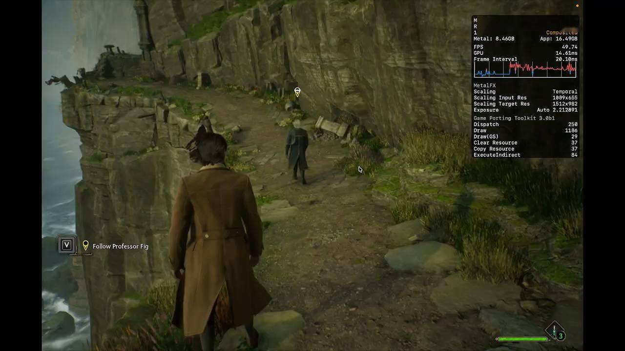然而,切换到 AMD FSR 后,性能显著下降,室内帧率降至 40 FPS 左右,户外则降至 30 FPS。测试表明,DLSS 在 Apple Silicon 上提供了更可靠的画质提升体验。